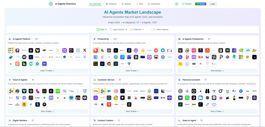 No portal (https://aiagentsdirectory.com/landscape) é possível verificar todas essas ofertas e eu precisaria de um monitor de 144 polegadas para capturar um print de toda a página (sem usar truques 🤣)
